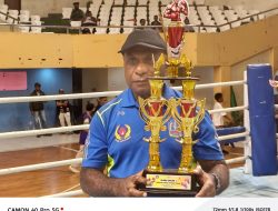 Pelatih Kepala Kontingen Kabupaten Jayapura, Nelson Sorontouw, mengangkat tropi juara umum Kejurda Pace Boxing Cup I Piala Gubernur Papua 2026 di GOR Cenderawasih, APO, Kota Jayapura, Sabtu (4/4/2026) malam. (Foto: Citra Papua.Com/Makawaru da Cunha)