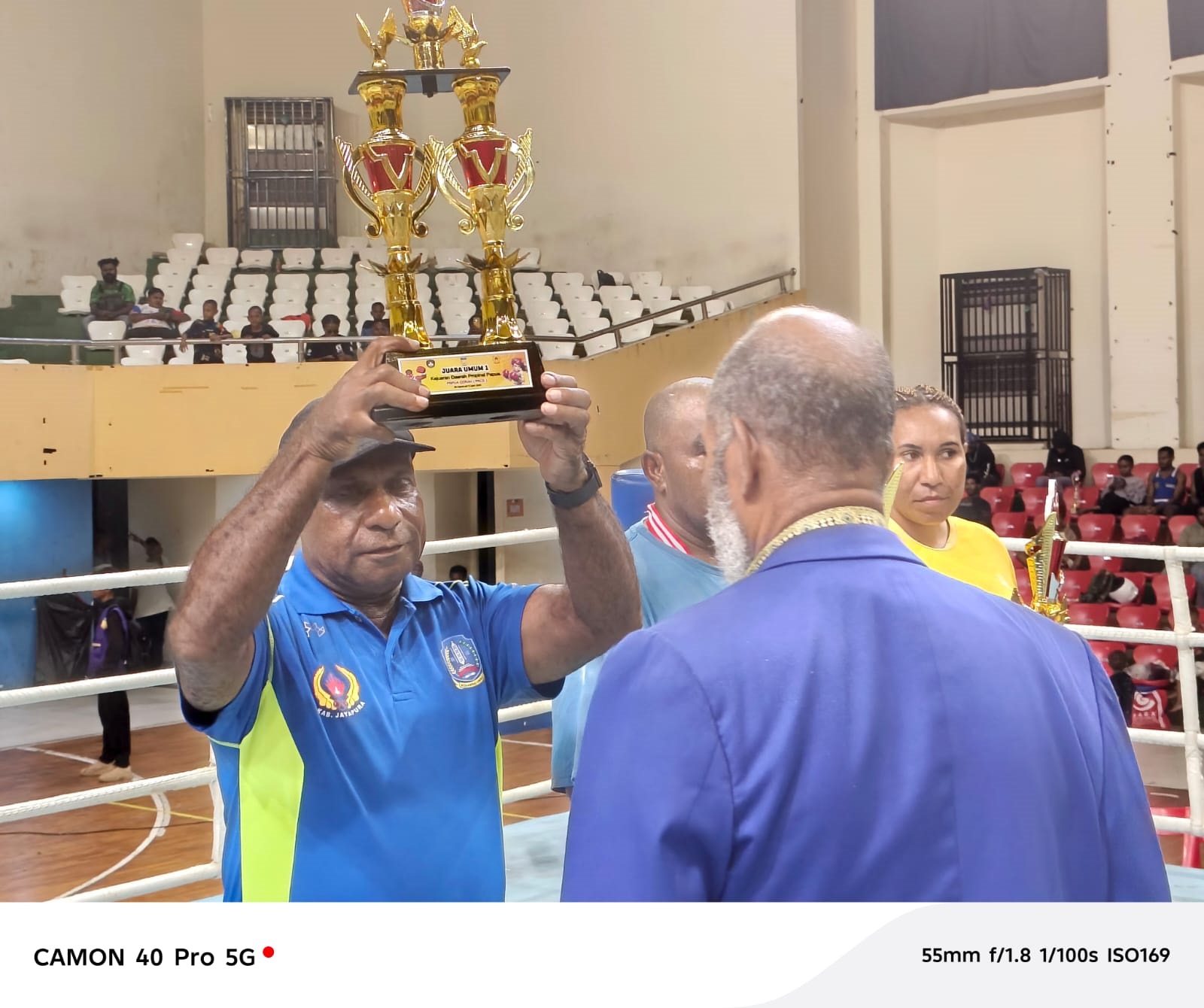 Pelatih Kepala Kontingen Kabupaten Jayapura, Nelson Sorontouw, mengangkat tropi juara umum Kejurda Pace Boxing Cup I Piala Gubernur Papua 2026 di GOR Cenderawasih, APO, Kota Jayapura, Sabtu (4/4/2026) malam. (Foto: Citra Papua.Com/Makawaru da Cunha)