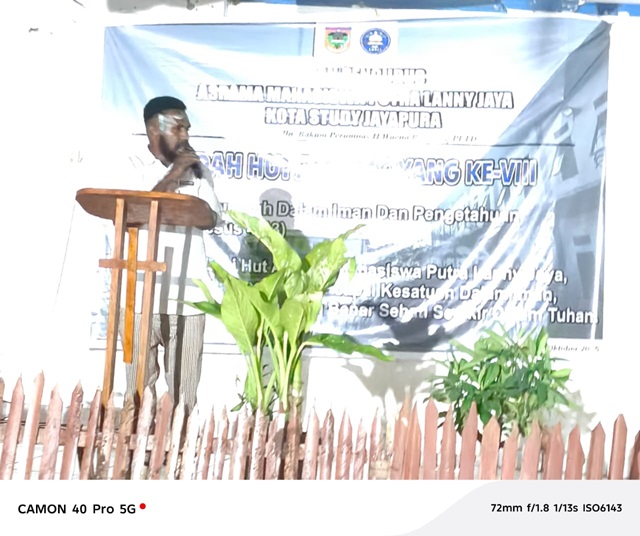 Ketua Asrama Mahasiswa Putra Lanny Jaya Kota Studi Jayapura, Ass Wanimbo, menyampaikan sambutan, usai Ibadah HUT ke-8 Asrama, Senin (29/10/2025) petang. (Foto: Citra Papua.Com/Makawaru da Cunha)