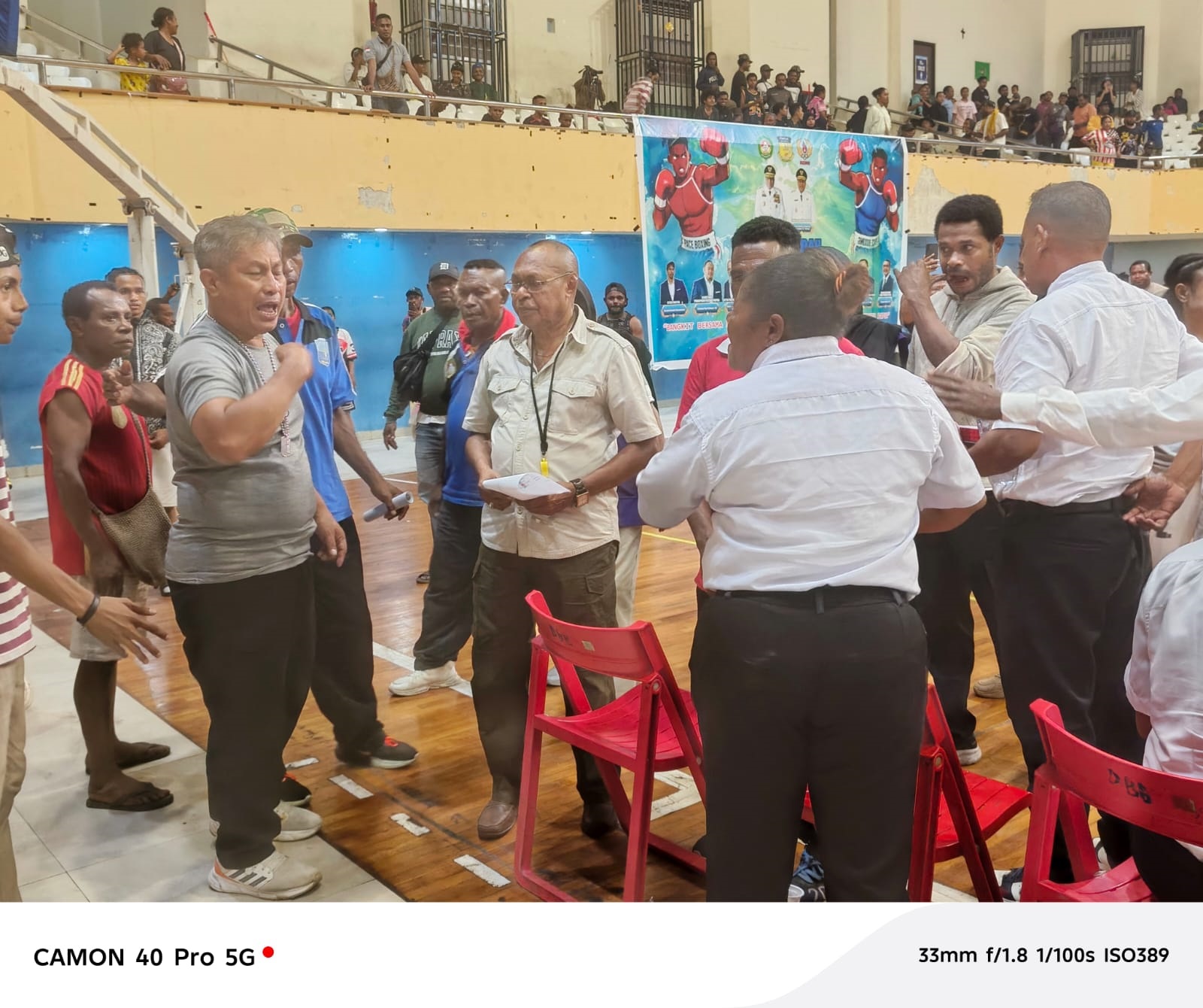 Kontingen Kepulauan Yapen melakukan aksi protes setelah petinjunya, Yacob Lawari, dinyatakan kalah angka dari Piter Manek asal Waropen dalam pertandingan yang digelar Rabu (1/4/2026) malam.