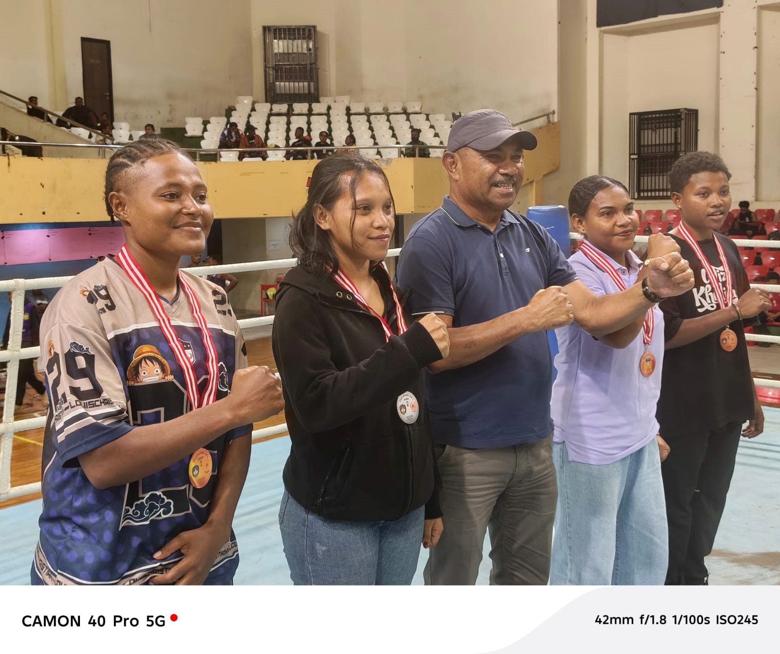 Plt Ketua Pengkab Pertina Biak Numfor, Simon Rumaropen, berpose bersama para juara kelas berat ringan/70 kilogram elite putri usai penyerahan medali pada Kejurda Pace Boxing Cup I di GOR Cenderawasih, Kota Jayapura, Sabtu (4/4/2026). (Foto: Citra Papua/Makawaru da Cunha)